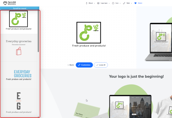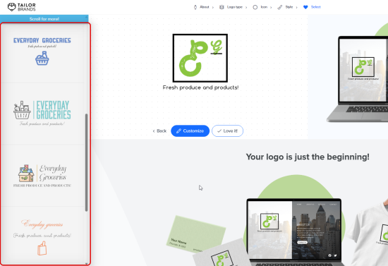 Using Tailor Brands to generate a logo for our fictional grocery store resulted in the following outcomes.