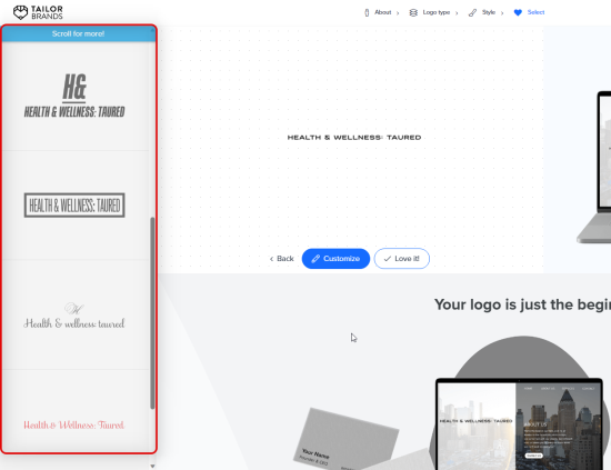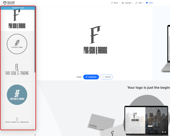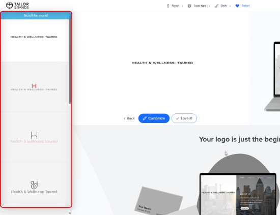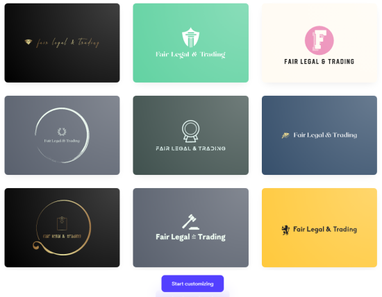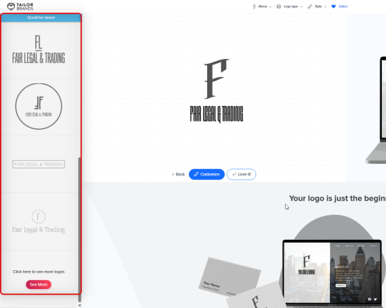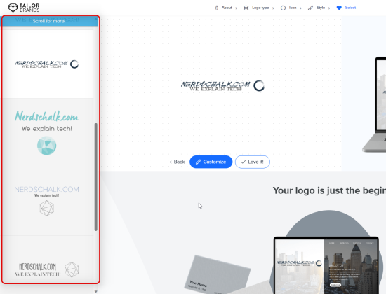 Tailor Brands is another comprehensive logo maker that focuses more on creative choices. It allows you to choose your field, preferred aesthetic, and how you want your logo to look be it an icon-based logo or a text-based logo. You can also choose your preferred icon styles as well as the fonts you like so that the AI generates the final results based on your choices.