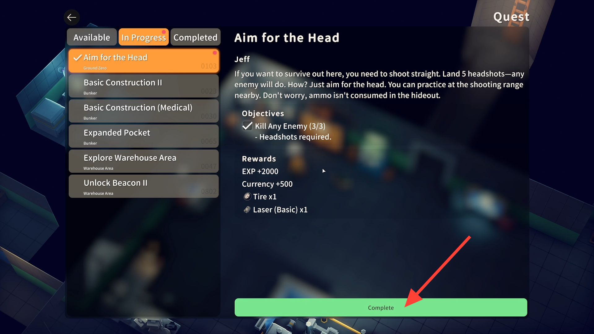 "If you want to survive out here, you need to shoot straight. Land 5 headshots – any enemy will do. How? Just aim for the head. You can practice at the shooting range nearby. Don't worry, ammo isn't consumed in the hideout."