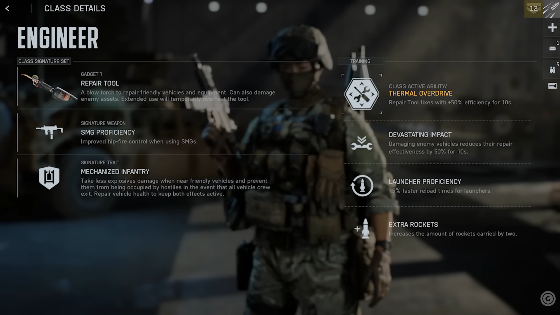 - Combat Engineer: Repairs faster, can detect nearby mines, and builds faster cover defenses.
