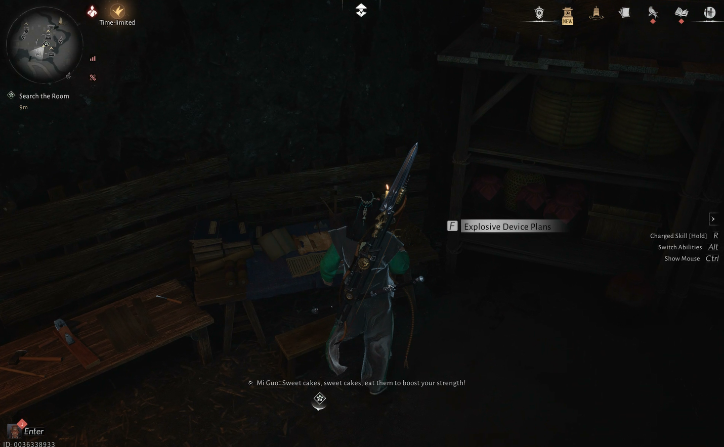 Enter the cave. Inside, search the chamber until you find the explosive blueprint placed on a wooden table.