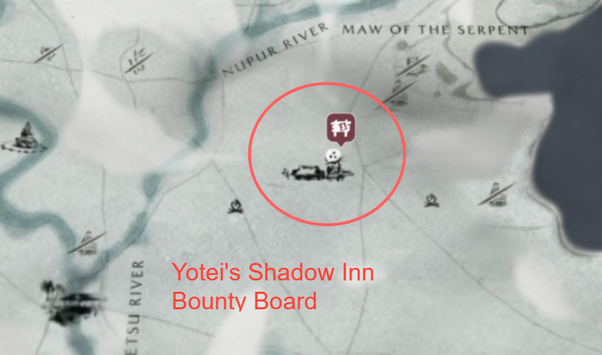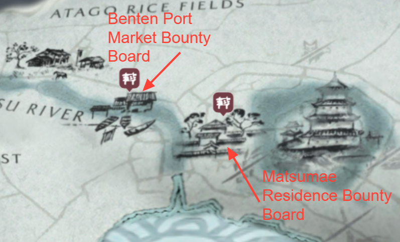 - Most bounties are picked up from bounty boards placed at main settlements (Shadow Inn, Market, Red Crane Inn, Huranui's Rest, Oshima Coast).