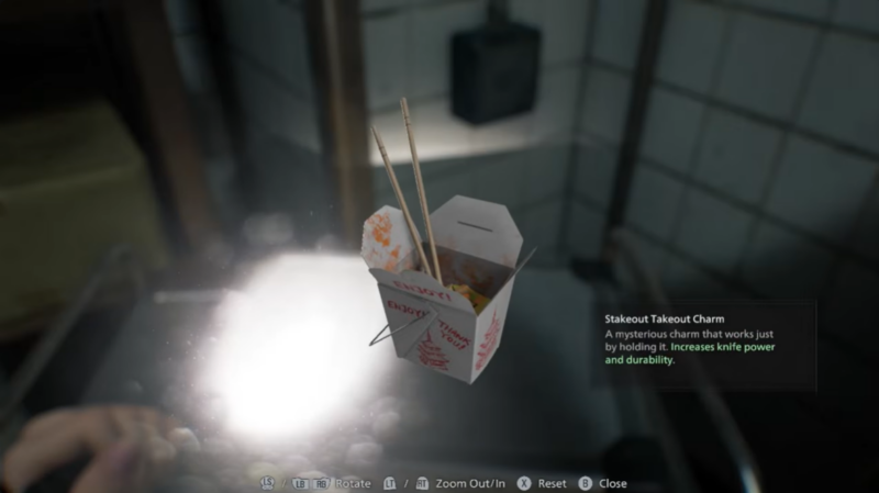 Inside the secret pantry, you’ll find handgun ammunition, scrap materials, and the Stakeout Takeout Charm, which increases knife power and durability. This synergizes well if you prefer melee efficiency or plan challenge runs.