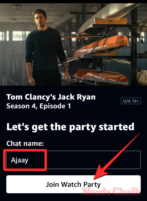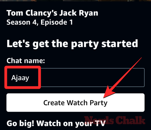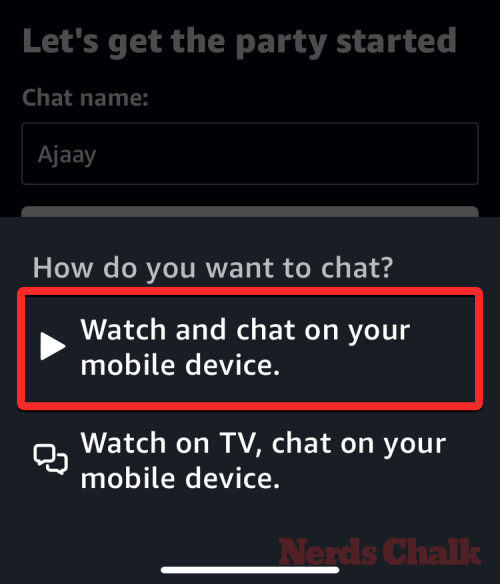 The Prime Video app on your phone will now open and it will load the “Let’s get the party started” screen. The app will now prompt you to create a “Chat name” for the Watch Party you’re about to create. By default, your name will be used in this section but you can change it to anything else, like your nickname. Once you’ve entered the Chat name, tap on the Join Watch Party button to proceed.