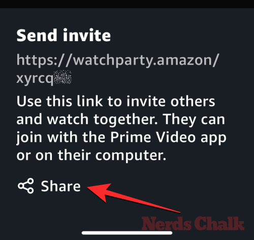 Prime Video will now create a link for the Watch Party you just initiated. To share this link with your friends and family, tap on Share inside the Send invite menu (or Invite others menu on Android) that appears at the bottom of the screen.