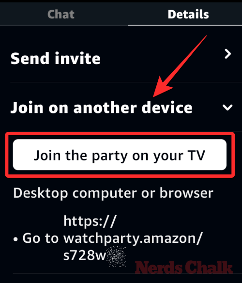 If you have started or joined a Watch Party using the Prime Video app on your phone, you can switch to watching the same content on your TV in such a way that you use your phone to only chat with others at the party. To join the Watch Party on your TV, tap on the Details tab under the video playback section.