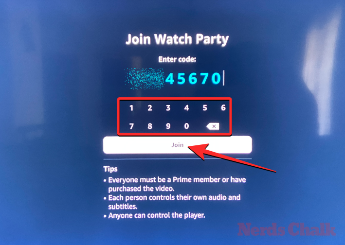 You will now reach the Join Watch Party screen on your TV. Here, using the number option available on the screen, enter the 8-digit code that showed up on your phone. Once you’ve entered the same code, press the Join button using the TV remote.
