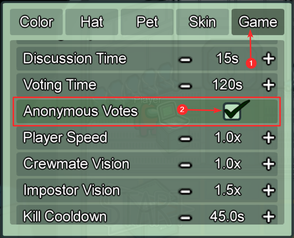 Next, click the Game option in the top right, and then scroll down a bit and find the Anonymous Votes option. Tick the checkbox to disable voting in Among Us.