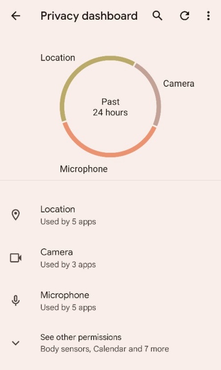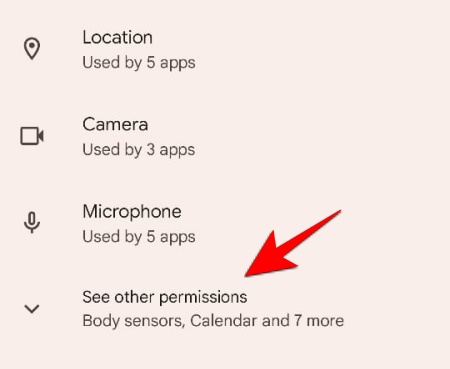 By default, only the three main categories are displayed – Location, Camera, and Microphone (the latter two also received their own quick toggles in Android 12). To see all the categories, tap on See other permissions.