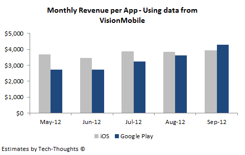 As you can see from one of the estimates above, the average monthly revenue from Android apps have steadily increased each passing month, and has actually overtaken the iOS App Store in Sep-12. This is a likely indication that apps being released first for iOS as a priority, may no longer be the case, now that Android apps have been seeing a progressively upward movement in the revenues generated for developers. To read the complete estimates report, hit the Source link below.