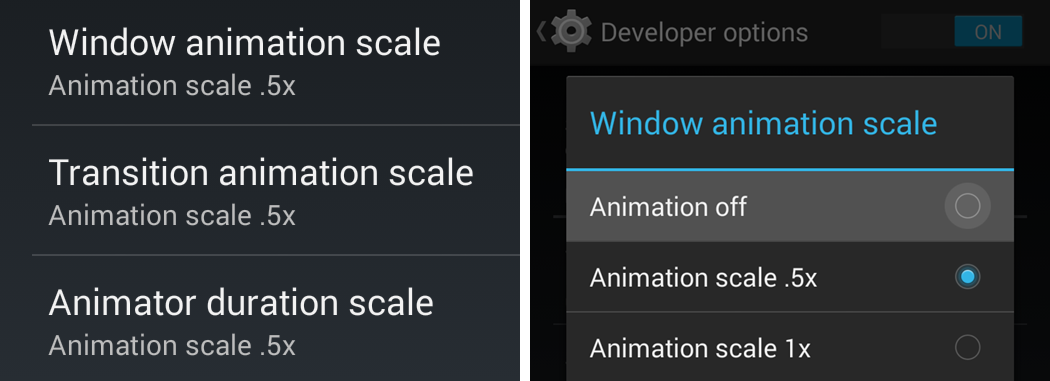 • Scroll a bit in developer option and you’ll see options for Window + Transition animations and Animator duration scale.