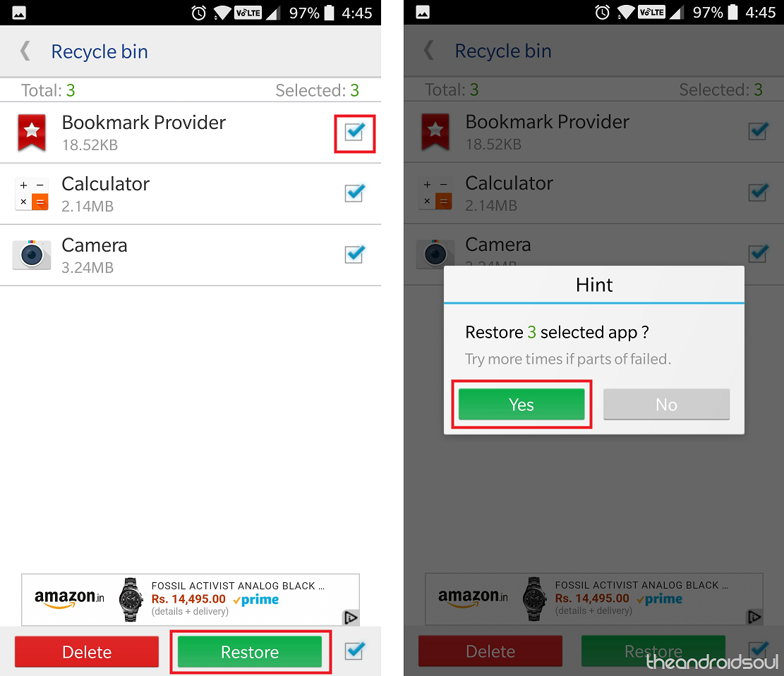 - Select the apps you want to restore by select the empty checkbox right next to them.