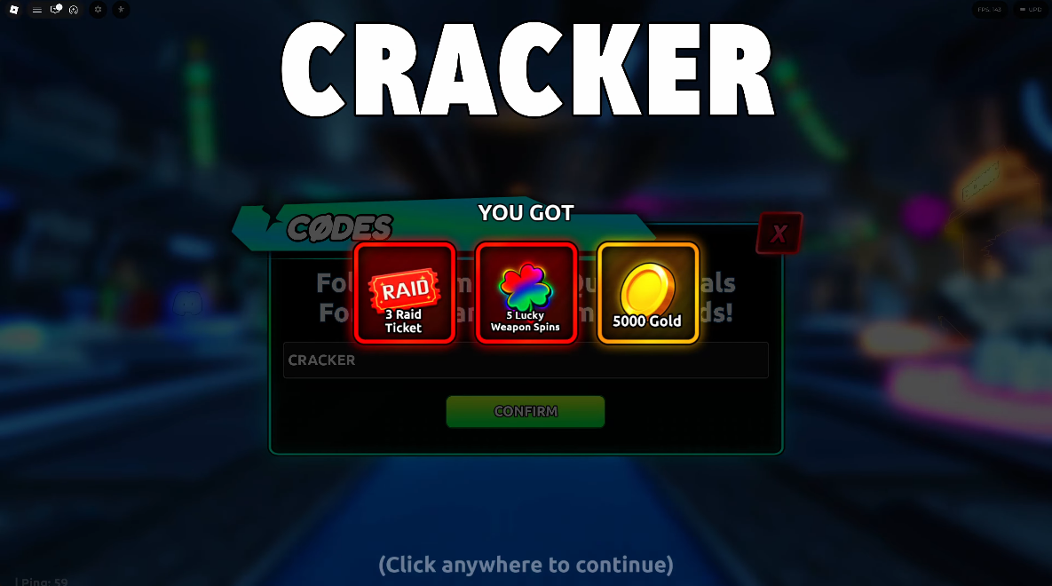 CRACKER - Redeeming this code rewards 3 Raid Tickets, 5 Lucky Weapon Spins, and 5,000 Gold.