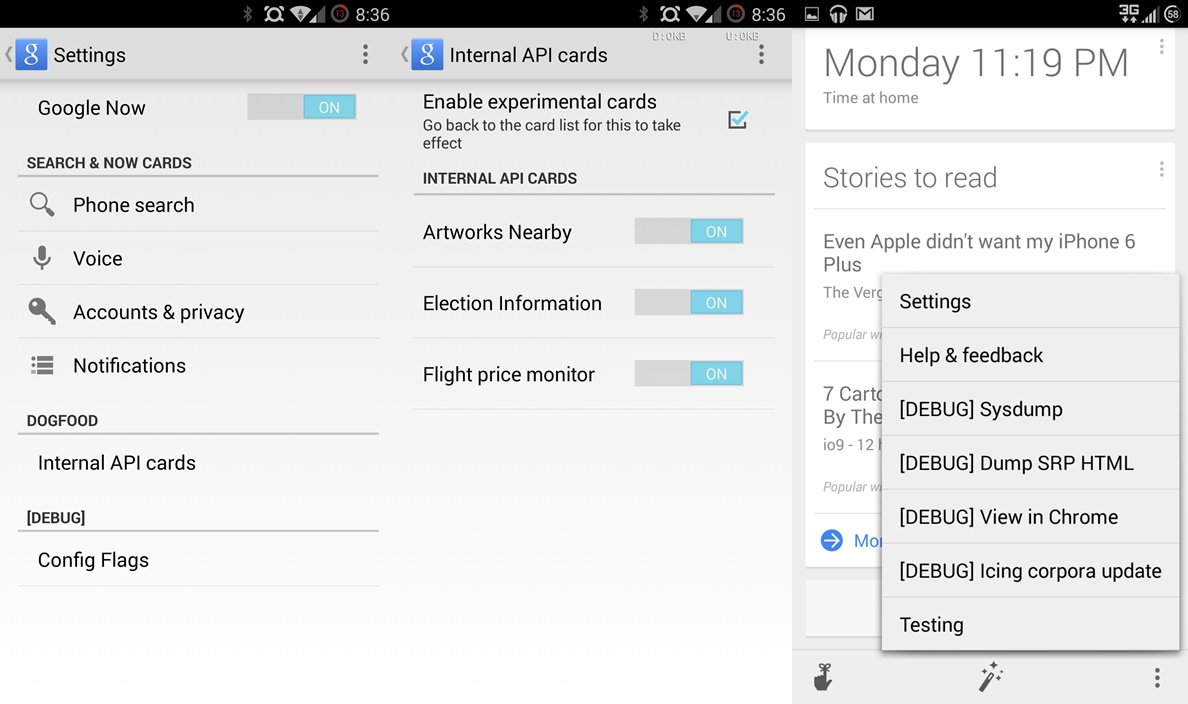 Once the app is installed, you have restart the Google Now service to apply the changes. After the service restart, open the Settings menu where you’ll find the Internal API cards which are the experimental Google Now cards which are yet to be released. You can also see the Flight Price Monitor in the list which recently saw the day light. Along with it, you can also see Artworks Nearby, which is another Nearby service that will show the list of art galleries in the nearby places. Election information is another Card which might be related to the snippets for the upcoming US elections.