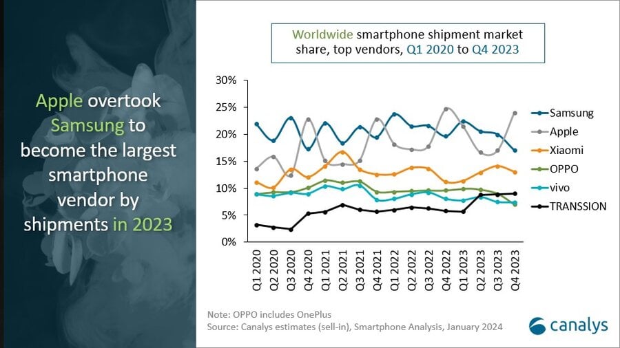 If numbers are anything to go by, 2023 was Apple’s year as it dethroned Samsung to sell the most devices worldwide. It’s the first time that Samsung hasn’t topped the charts in the past 13 years, hinting at a downturn for the former champion. Here’s a closer look at the numbers.