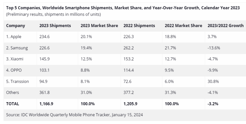 According to IDC’s Worldwide Quarterly Mobile Phone Tracker report, Apple claimed the top spot for the number of smartphone shipments in 2023. With 234.6 million units shipped worldwide, Apple has edged past Samsung’s 226.6 million shipments, and become the table topper for the first time ever.