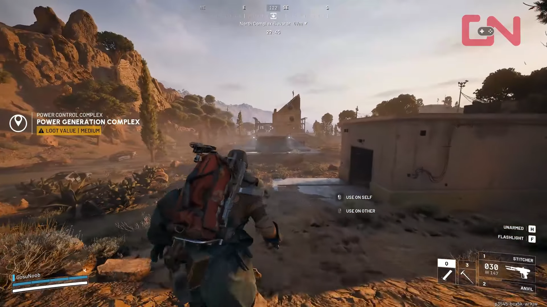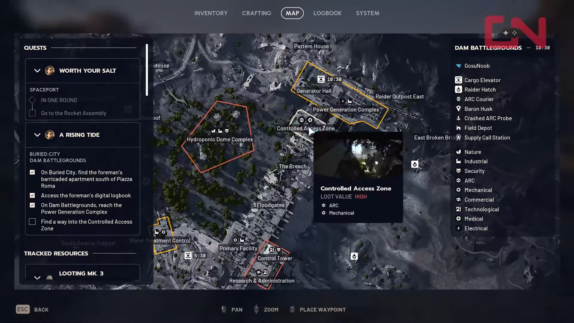 Shift to Dam Battlegrounds’ northern Power Generation Complex, then move southwest to the Controlled Access Zone near a metal grate with ladder access, featuring walkways, hanging ARC machines, and overlooked rooms.