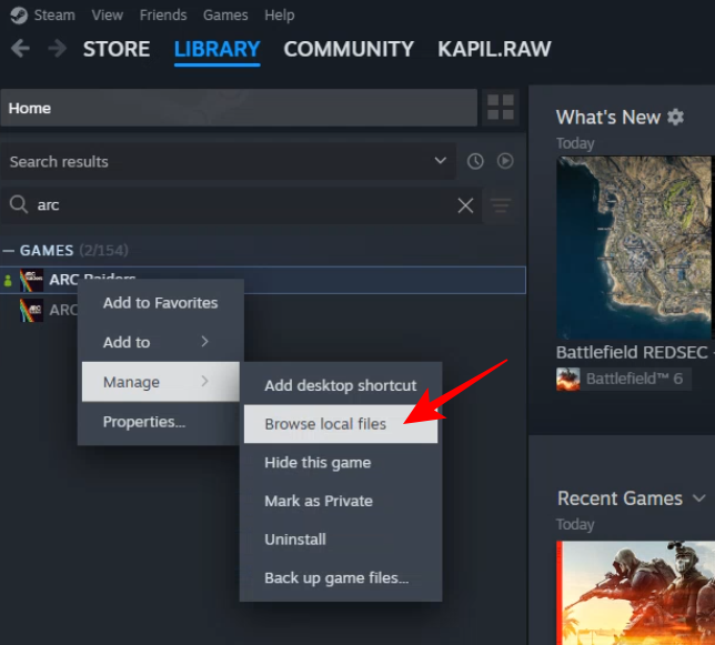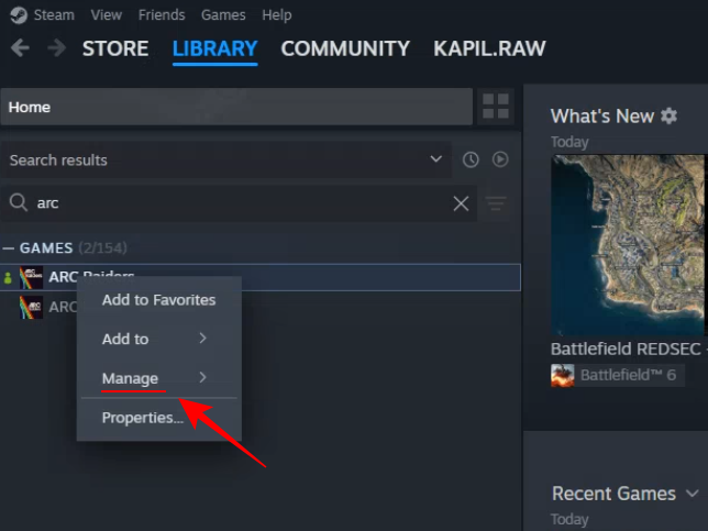 Open Steam. Then right-click on ARC Raiders and select Manage.