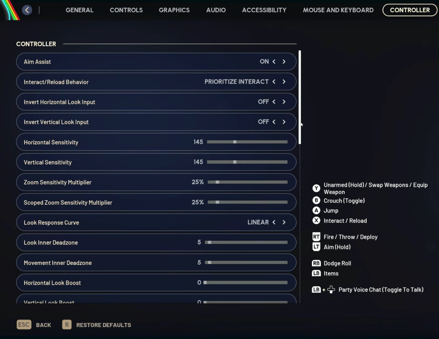 | Look | Horizontal sensitivity | 145 |