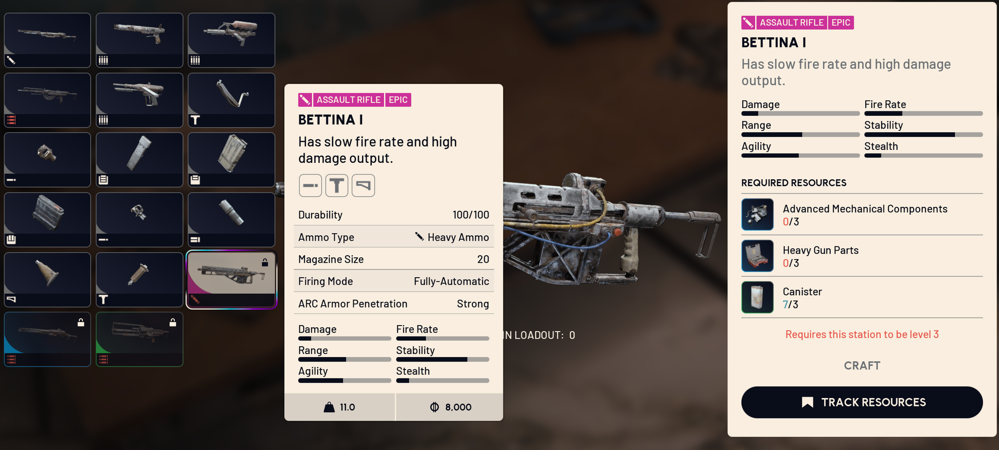 | Bettina II → III | Materials needed: 1× advanced mechanical component, 2× heavy gun parts. Upgrade benefits: +10% fire rate, −22.2% reload time, +20 durability. |