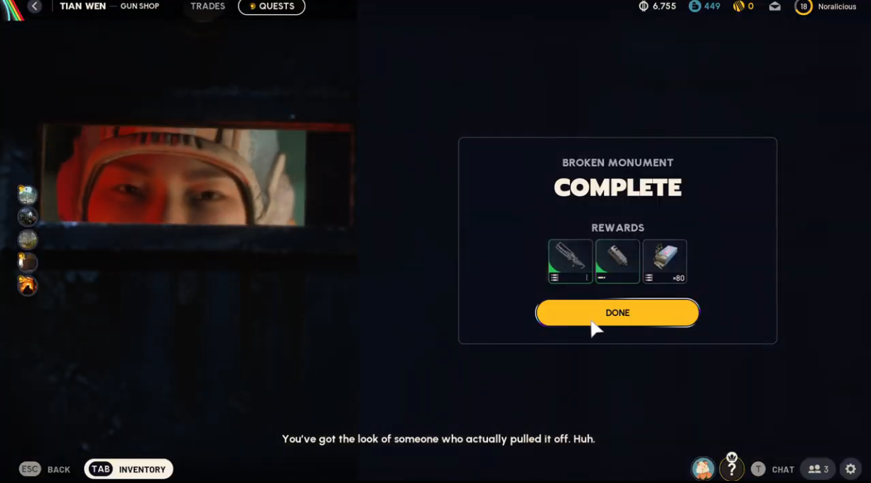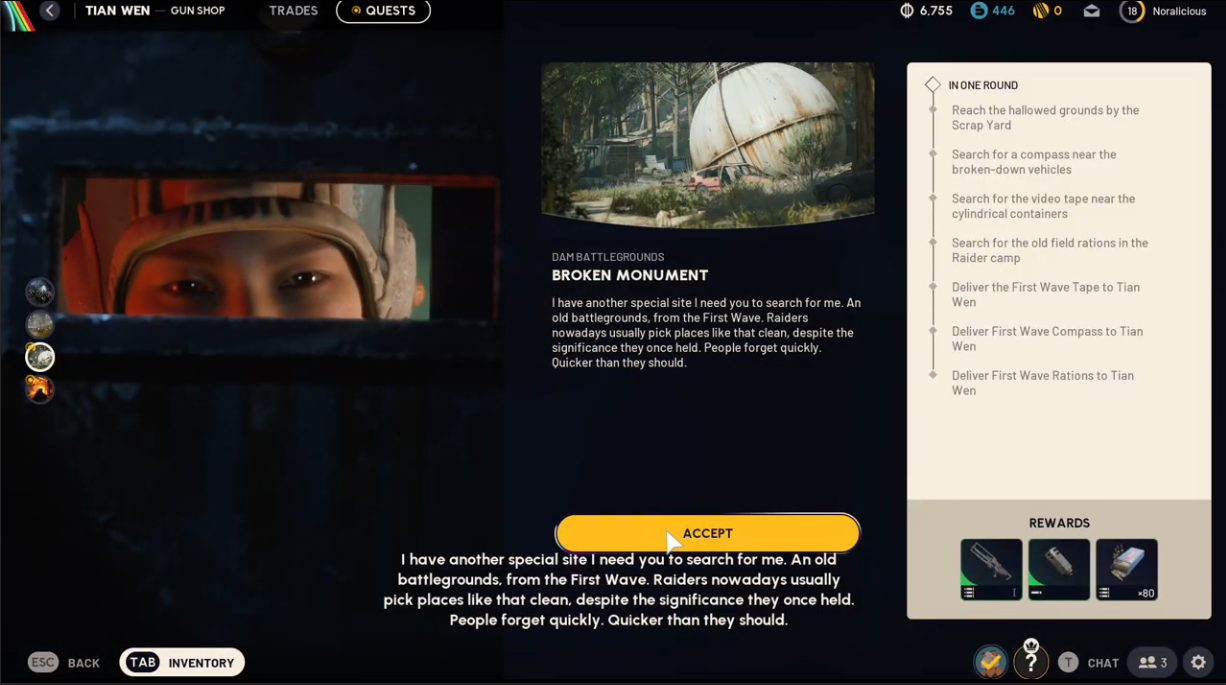 The quest Broken Monument is given by Tian Wen at the Gun Shop. It sends you to the Dam Battlegrounds to recover relics from the First Wave era. You’ll earn key rewards, including weapon parts and crafting resources.