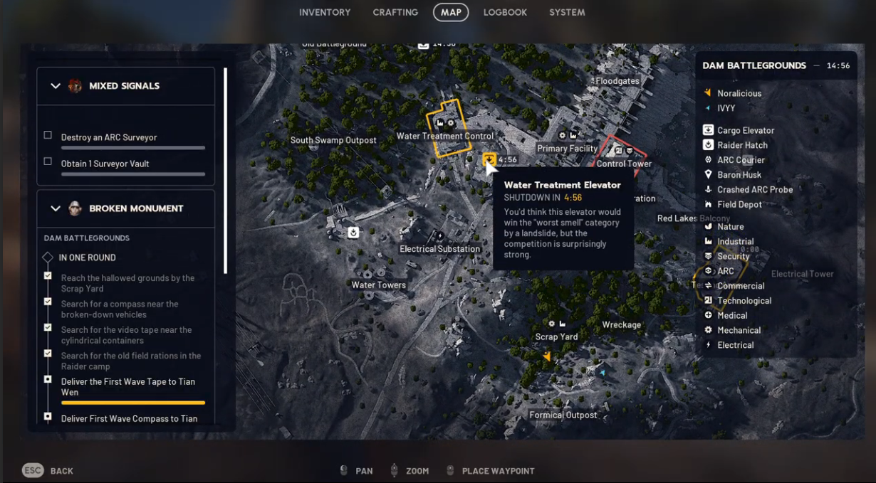 Once all relics (Compass, Tape, and Rations) are collected, head to the Cargo Elevator near the Water Treatment Facility.