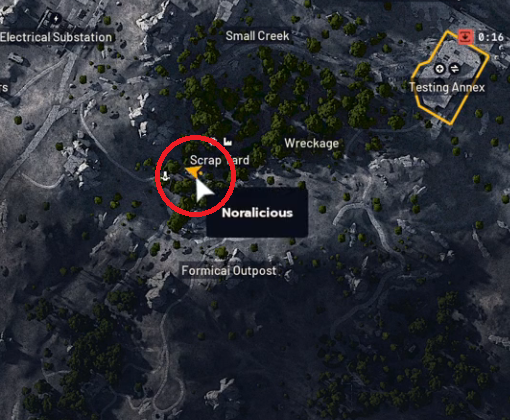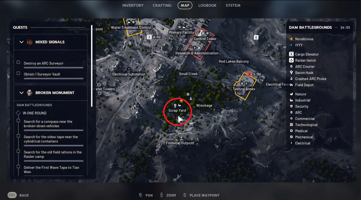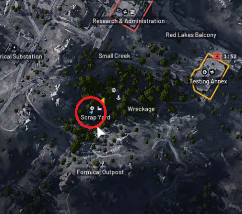 This quest unfolds in the Dam Battlegrounds, specifically around the Scrap Yard area. You’ll explore a zone filled with broken-down vehicles, cylindrical containers, and Raider camps, each hiding one of the three relics you must collect.