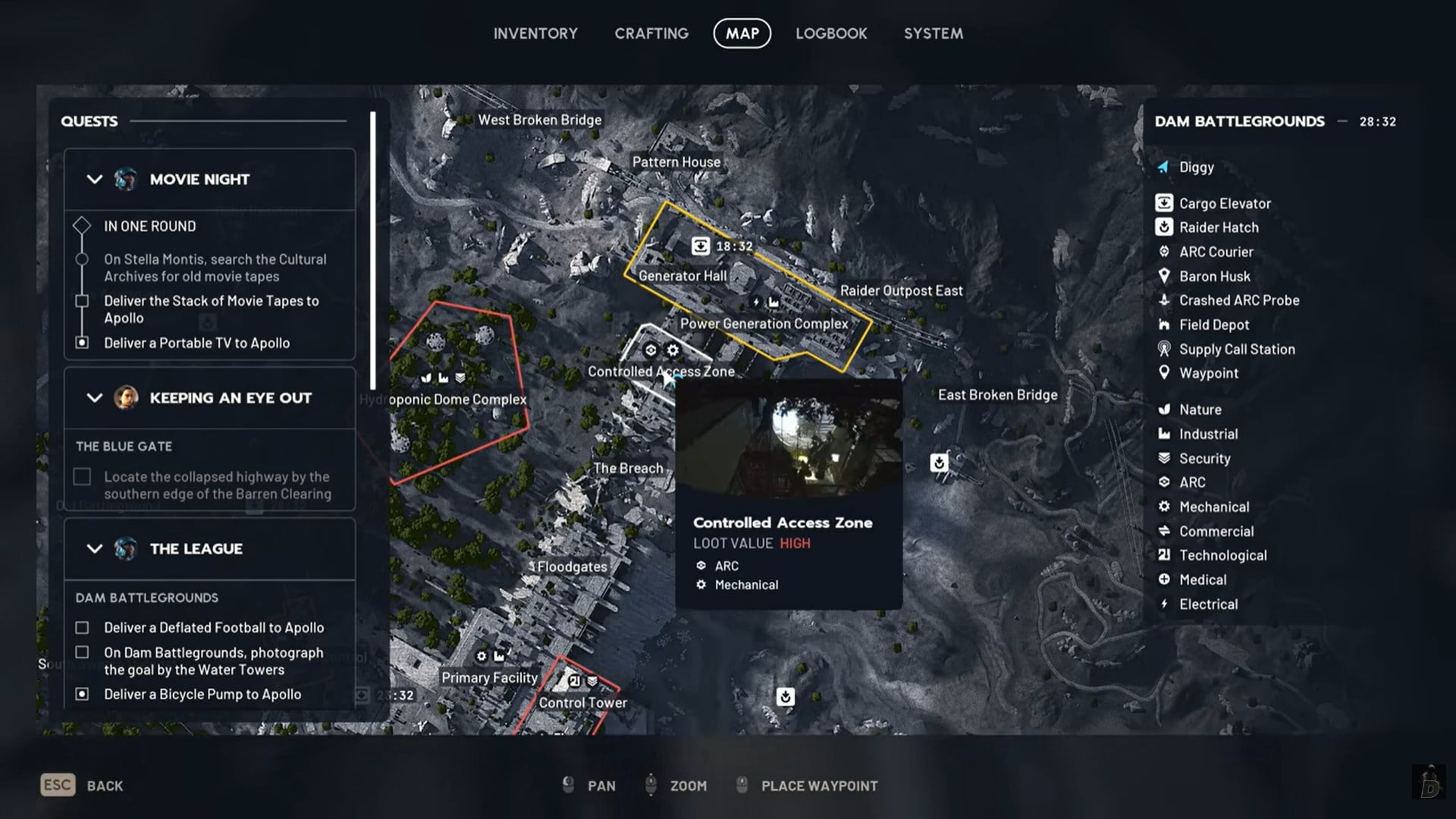 The puzzle room is located inside the Controlled Access Zone on Dam Battlegrounds. You’ll find it beside the breach area and the pipeline tower structure. This zone is clearly marked on the map and categorized as high loot value, particularly for ARC and mechanical items.