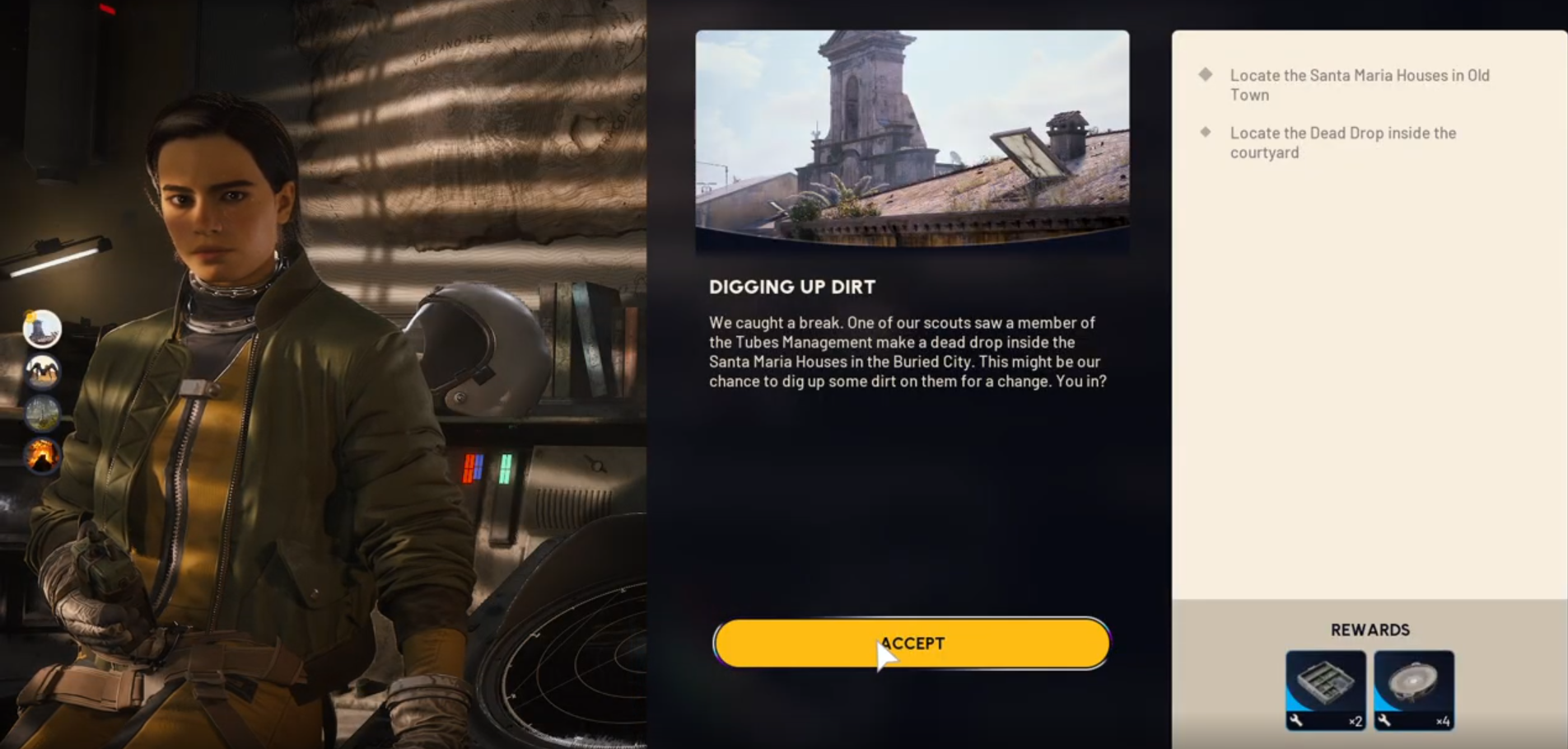 “One of our scouts saw a member of the Tubes Management make a dead drop inside the Santa Maria Houses in the Buried City. This might be our chance to dig up some dirt on them for a change. You in?”