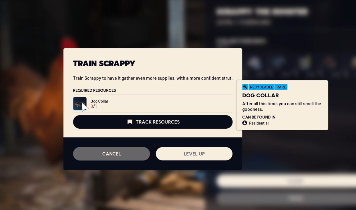 Once you have a dog collar, navigate to Scrappy’s section in the main menu and select the option to train or upgrade.