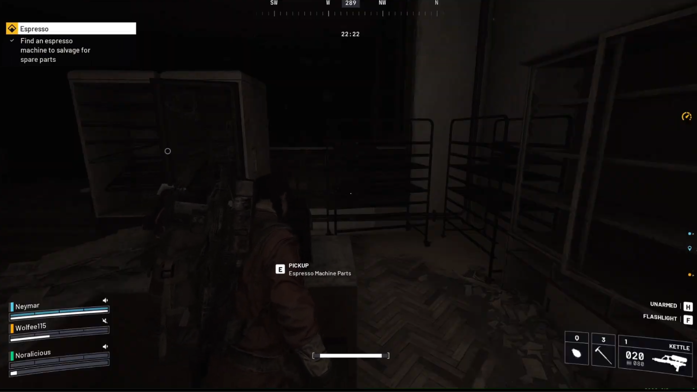 - Salvage spare parts by interacting with the espresso machine on the bar counter.