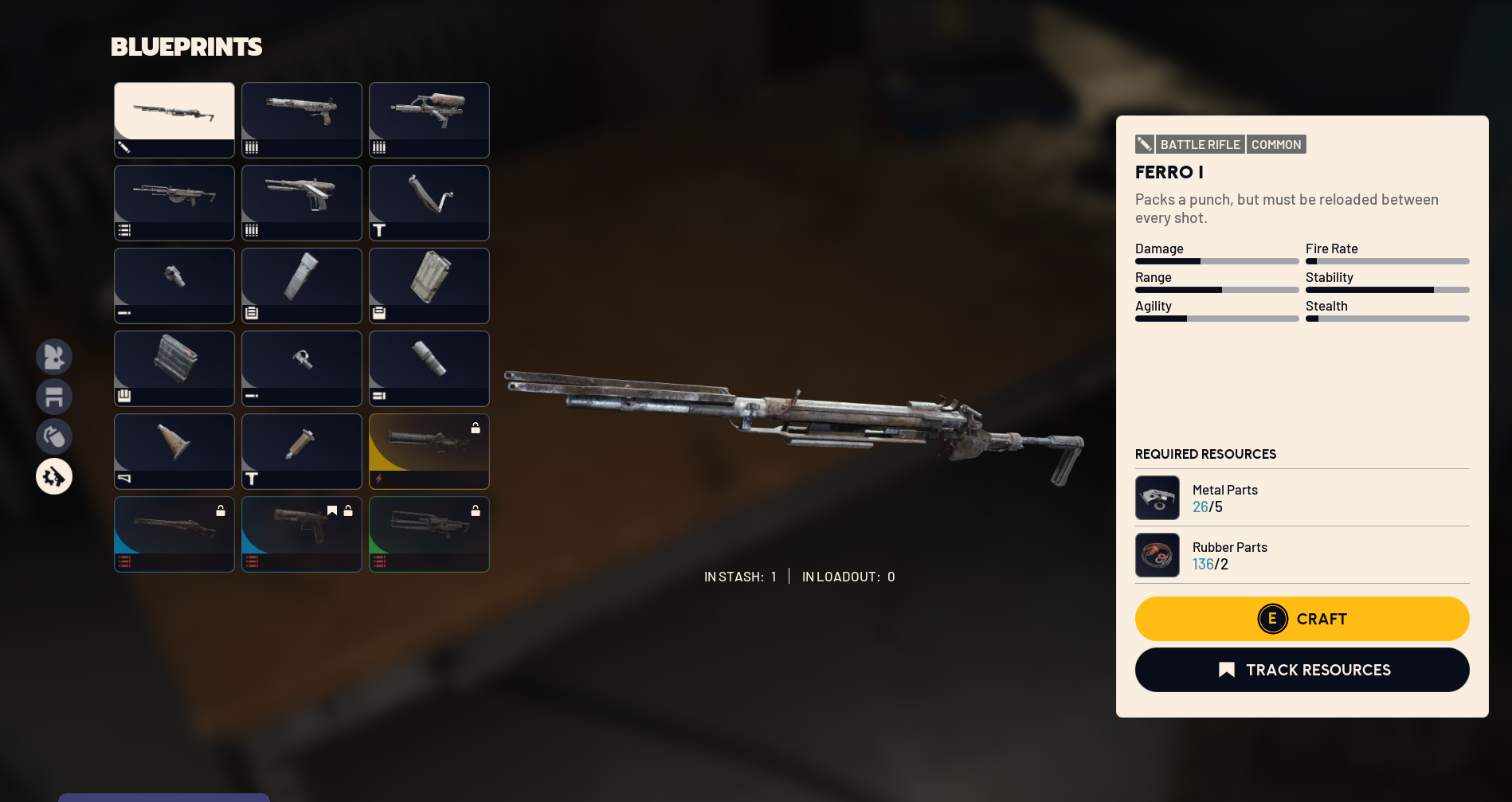 | Ferro I | Required materials: 7× metal parts. Workshop level: Gunsmith 1. Upgrade benefits: Base weapon. |