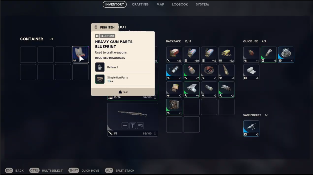 - Recipe: 4 × Simple Gun Parts → 1 Heavy Gun Parts (per heavy part).