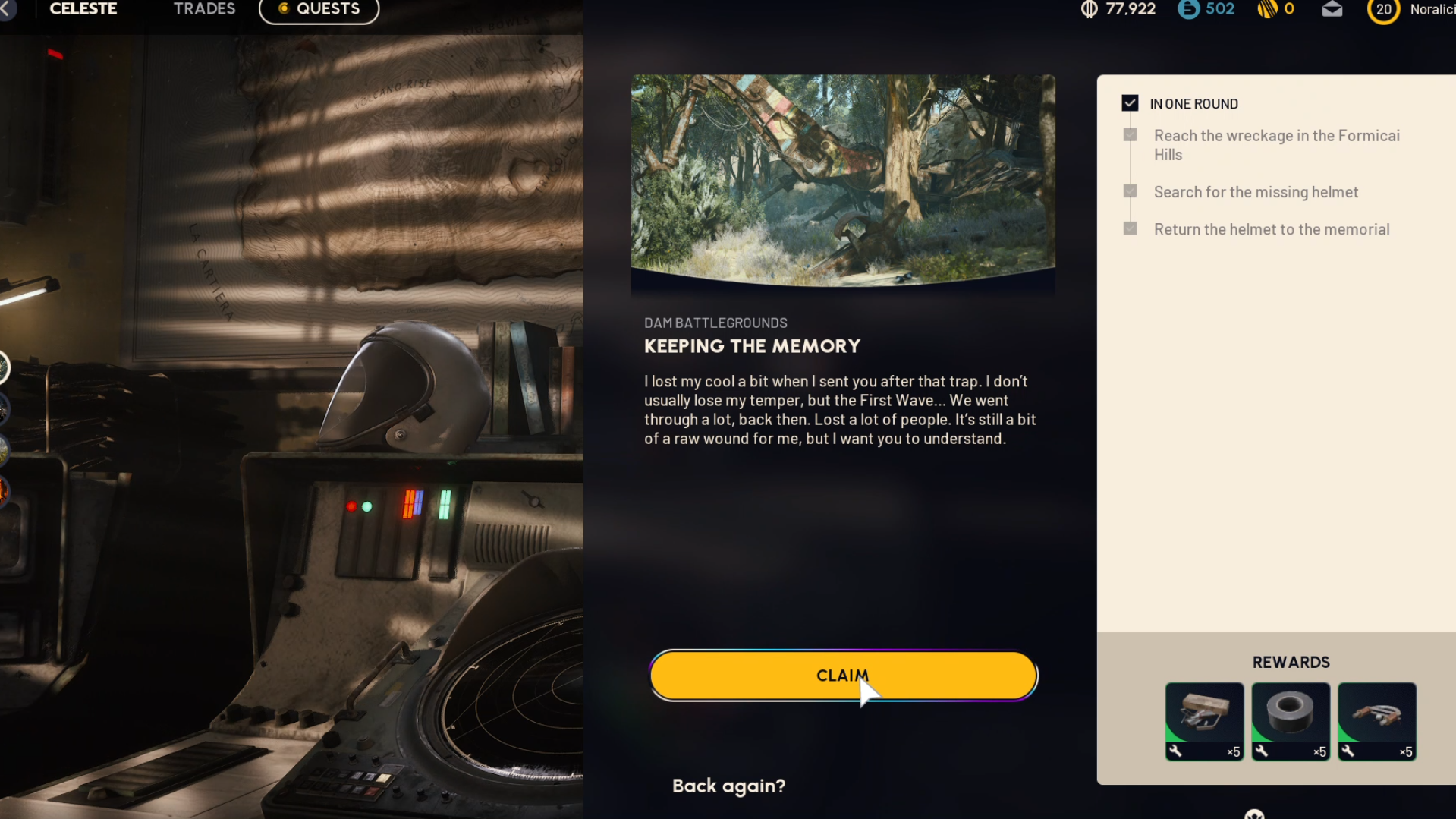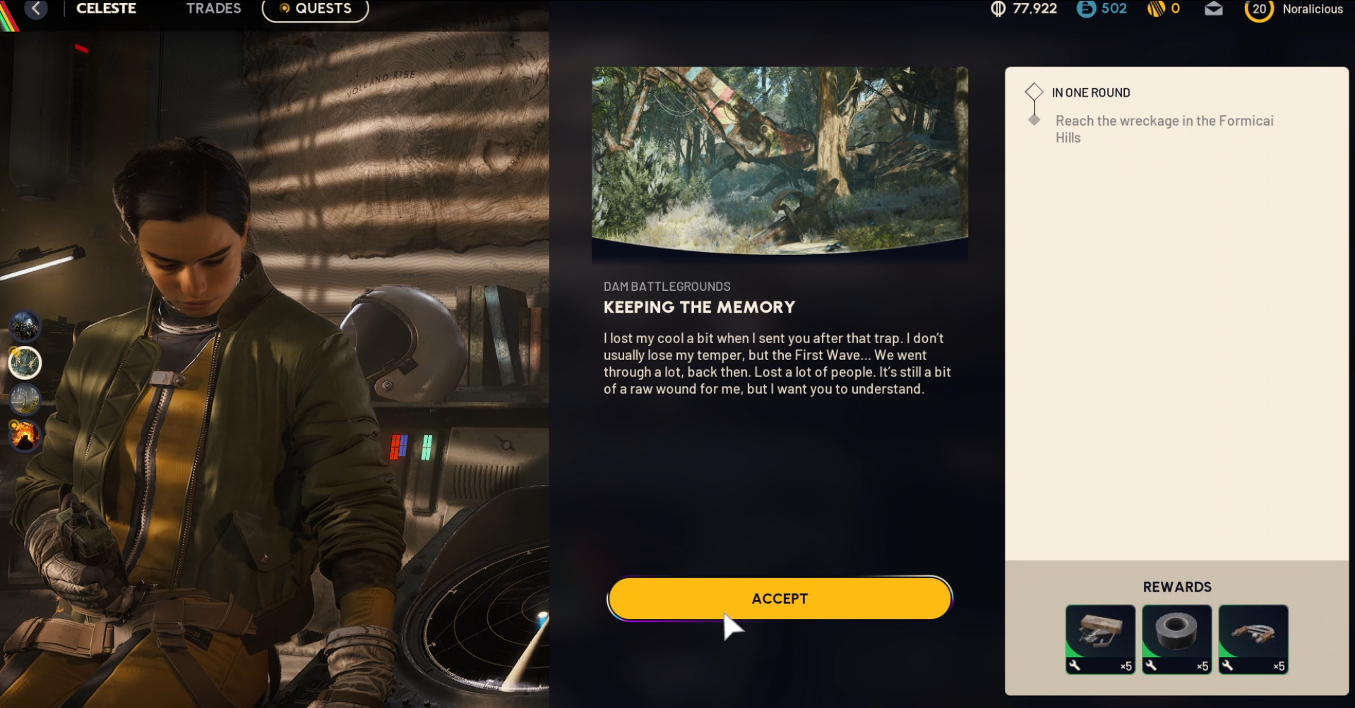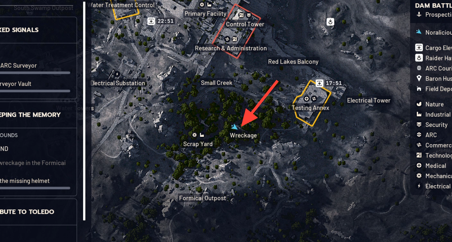 Keeping the Memory is a short quest in Arc Raiders where Celeste requests your help to recover a lost helmet from the Formical Hills' wreckage site on the Dam Battlegrounds map. The site is marked by a giant ruined spider-like robot, easy to spot in the southern forested region between the Scrap Yard and Testing Annex.,