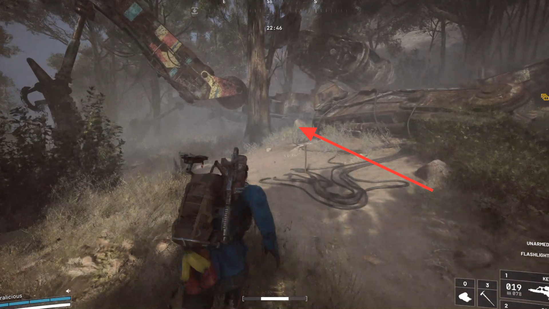 At the marked spot shown above, check near the wreckage by a bush with wires running to a stick — the helmet is hidden beside the bush; interact to collect it.