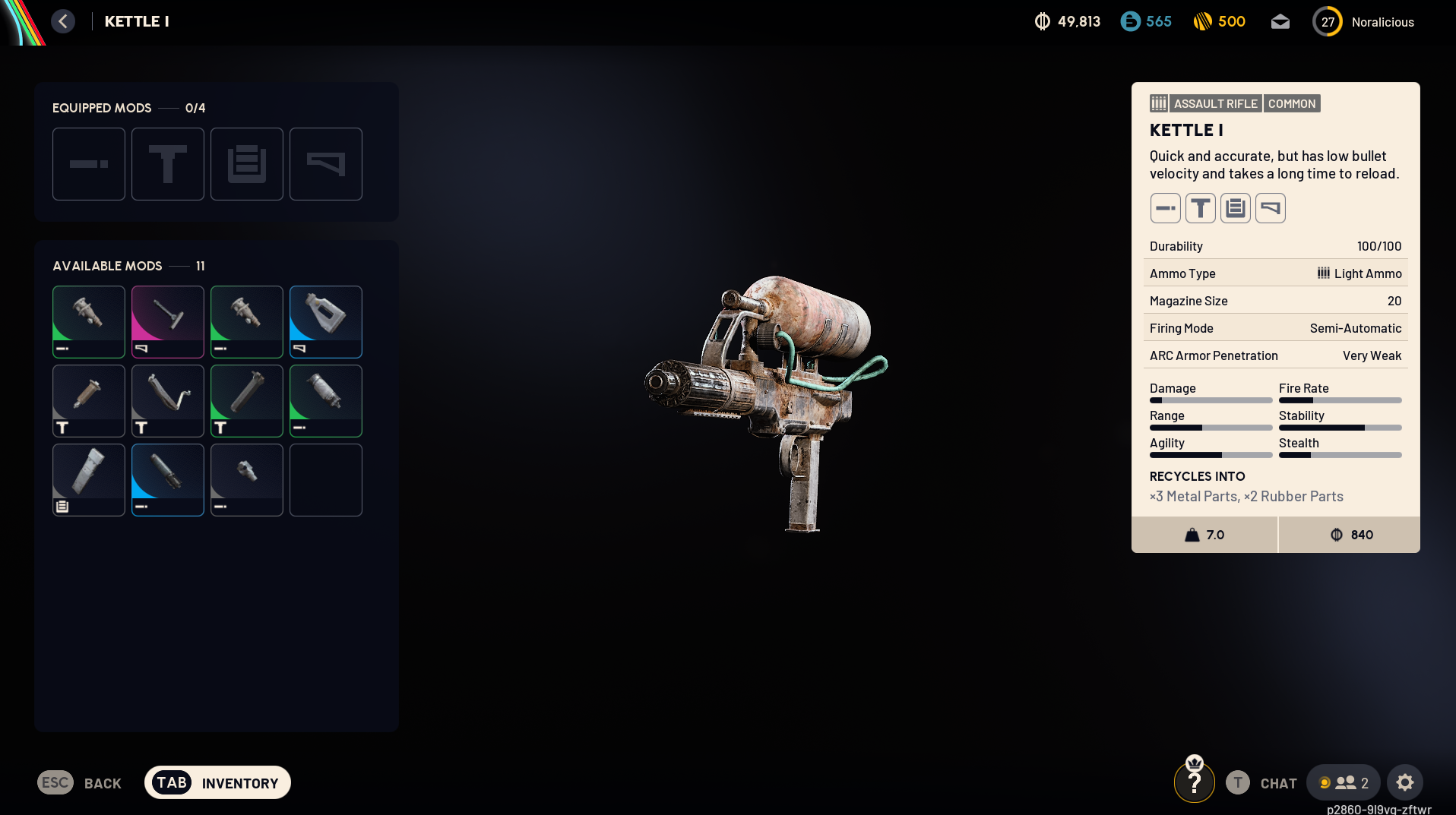 | Kettle III | Materials needed: Kettle II, 10× metal, 1× gun part. Crafting station level: Gunsmith level 1. Upgrade benefits: +50% bullet velocity, −26% reload time. |