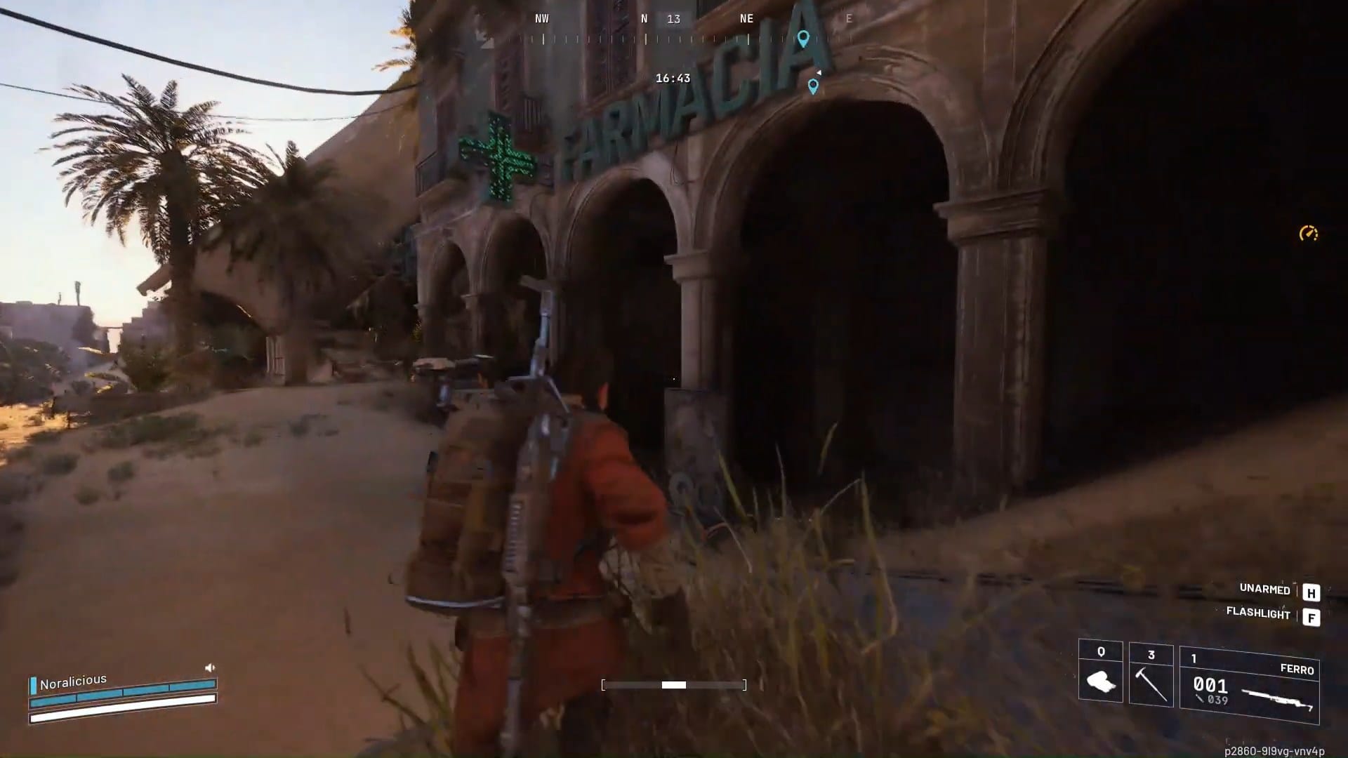 Travel to the Buried City and locate the collapsed highway. Approach the Arbusto Farmacia marked by a green cross sign.