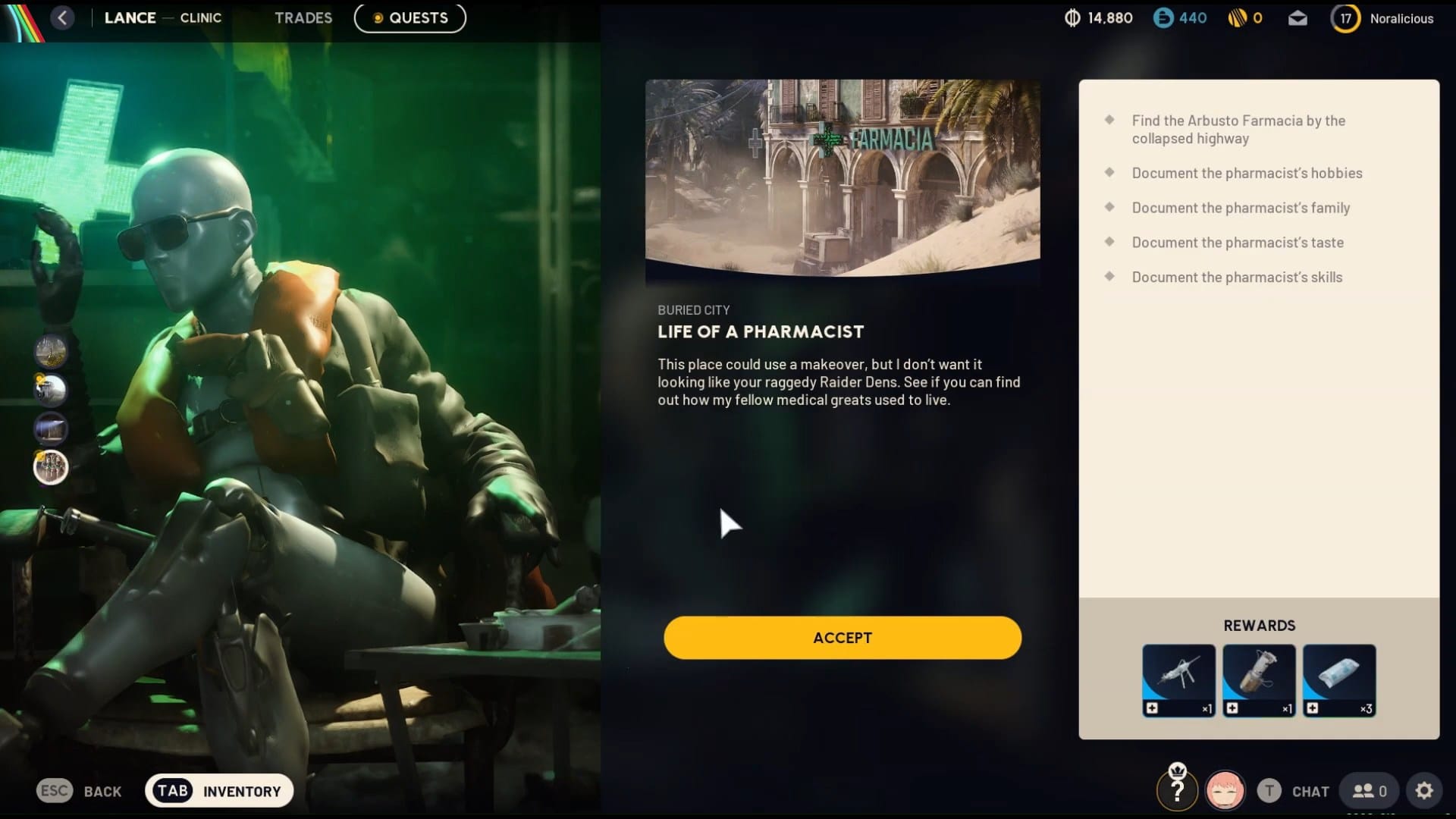 Finish by recording the pharmacist’s skills, found in old prescriptions or medical instruments. Return to Lance at the Clinic to complete the quest and claim your reward.