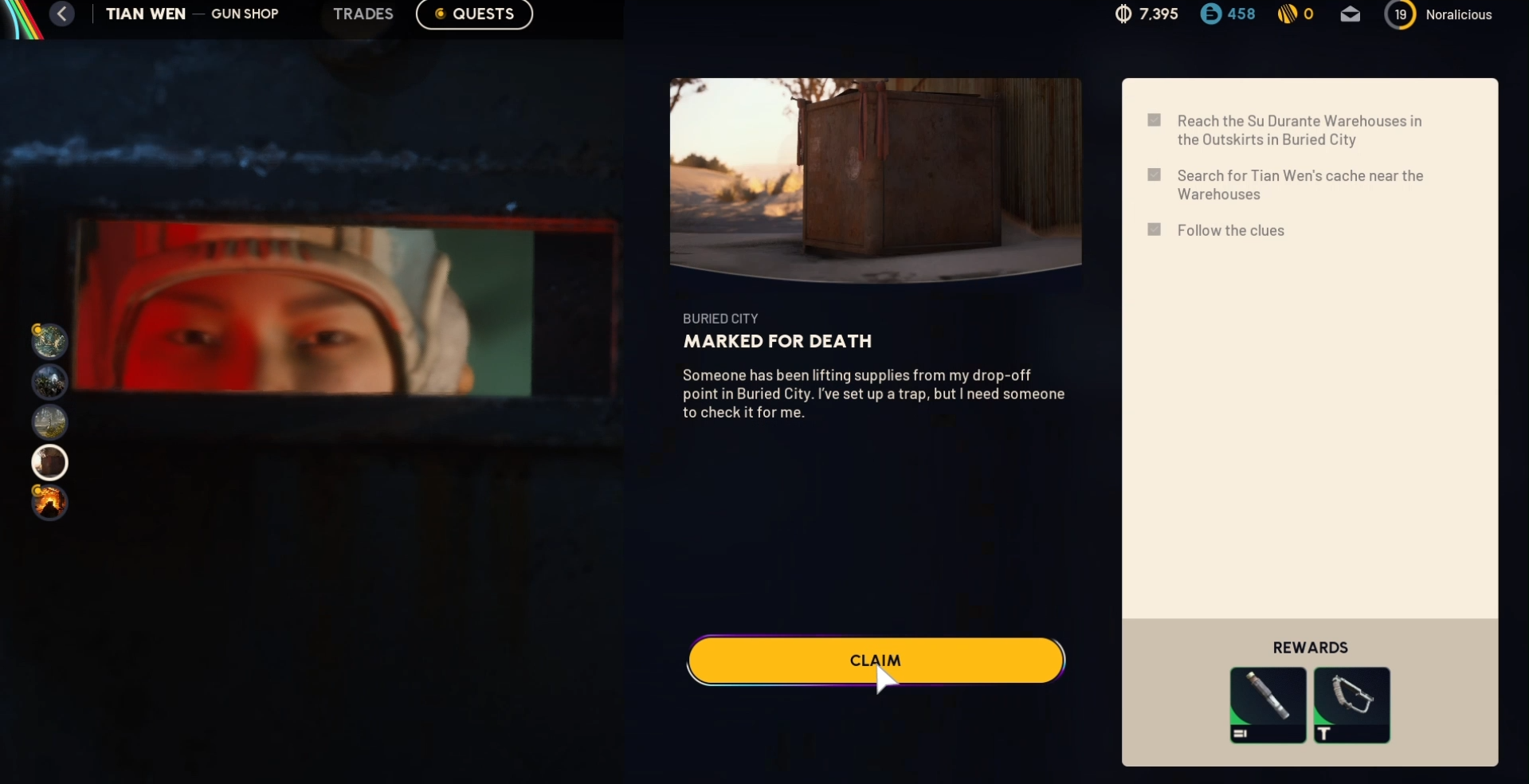 Marked for Death in Arc Raiders is a relatively straightforward investigation quest set in the outskirts area of the Buried City map. You start by accepting it from Tian Wen at the trader menu. The quest's primary objectives are to reach the Su Durante Warehouses, search for Tian Wen’s cache nearby, then follow clues to a second item.