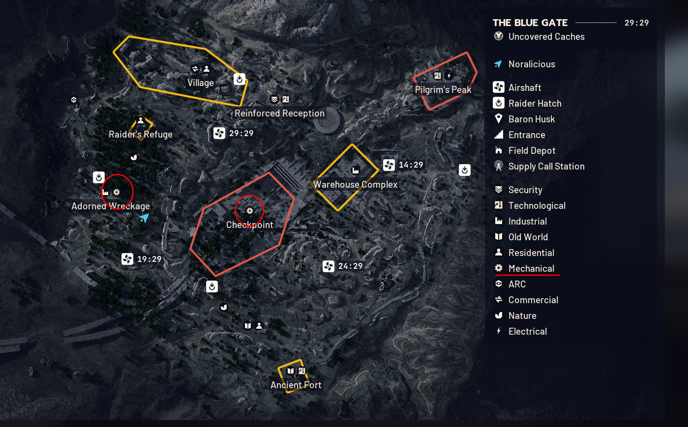 Mechanical Components are mainly found in the regions marked 'Mechanical' on (all) the maps. Focus on areas with the gear icon and scavenge there (particularly the 'Checkpoint' area in Blue Gate).