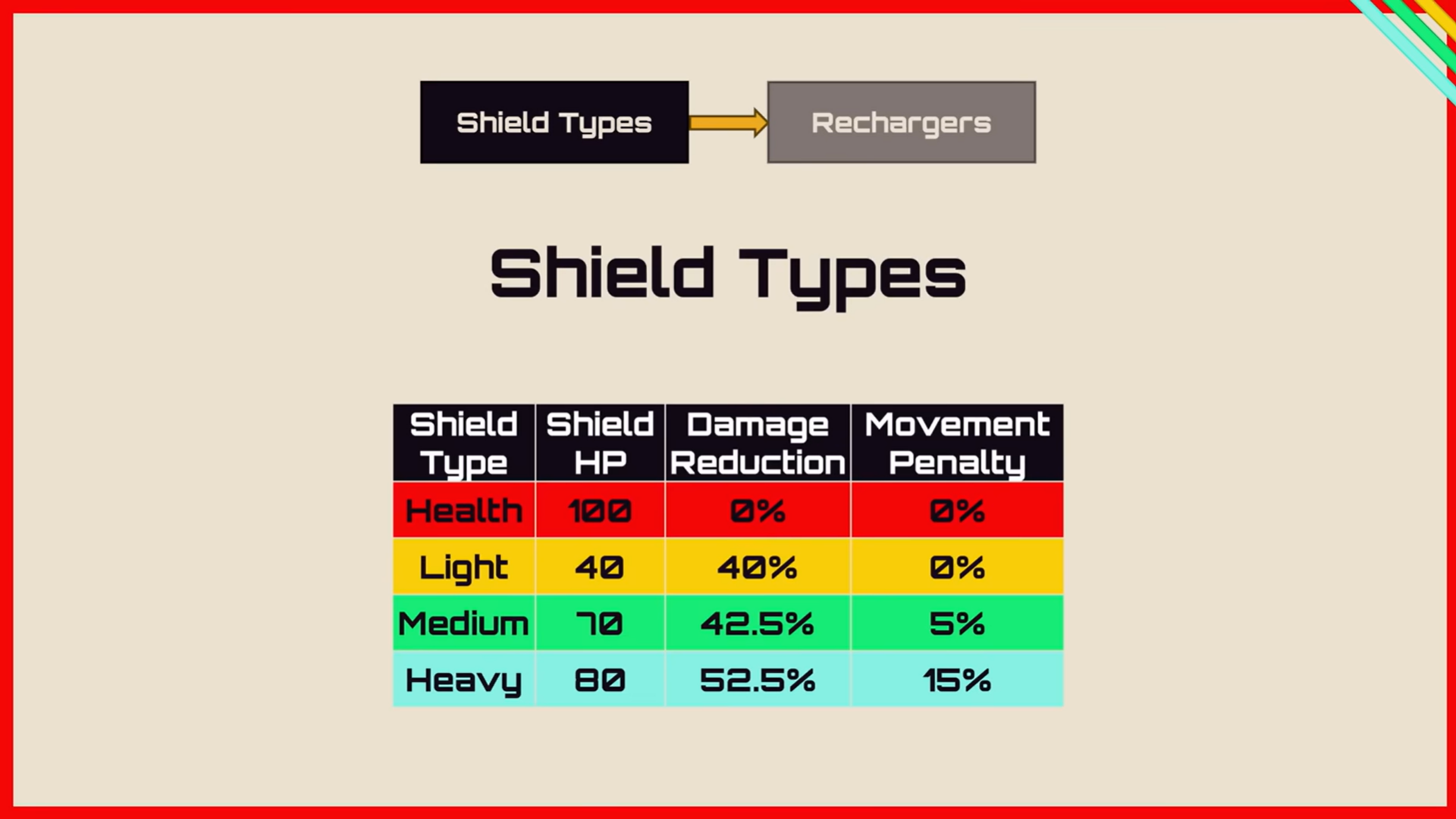 Shields act as a dedicated barrier that absorbs a portion of damage before HP is affected. In the example, light shields provide 40 shield HP and 40% damage reduction, medium shields 70 shield HP with about 52.5% damage reduction, and heavy shields 80 shield HP with about 52.5% damage reduction and a movement penalty.