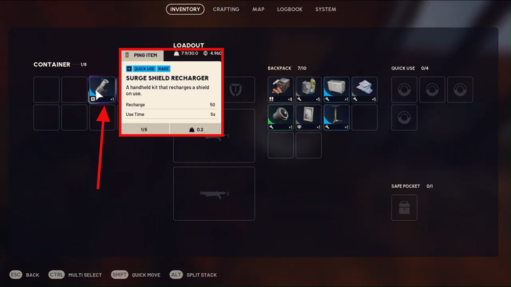 Made with one advanced arc power cell and one electrical component, taking 5 seconds to use. Instantly provides 50 shield HP without over-time charging.