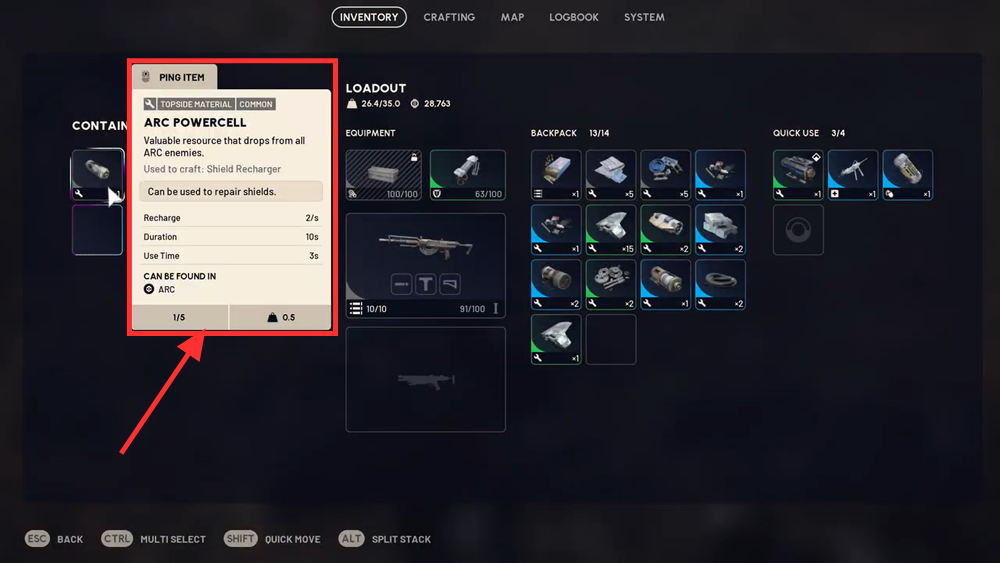 Prioritize looting arc power cells and rechargers, as they enable sustained raids; heavy shields demand more resources like 3 basic rechargers or 6 arc power cells.