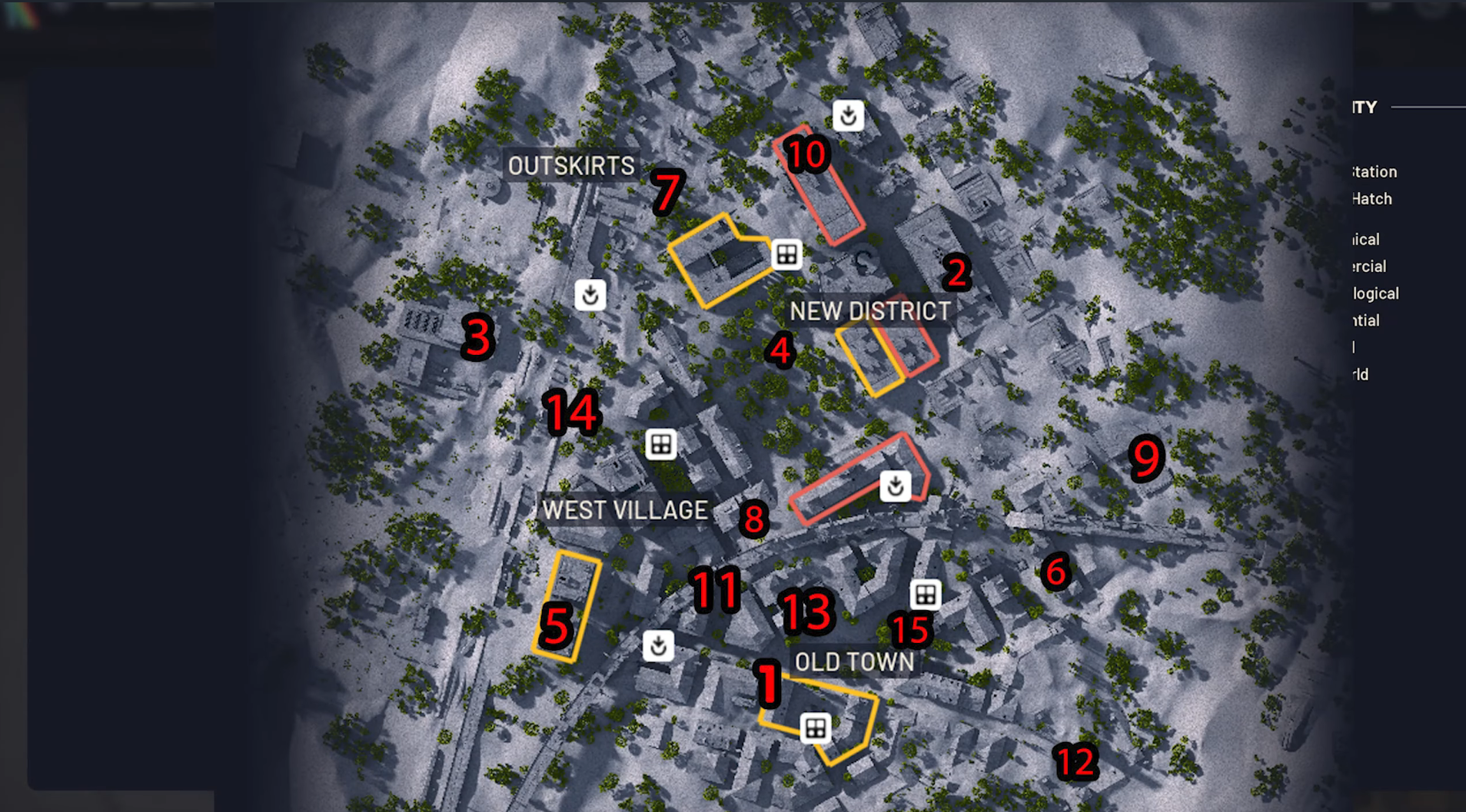 | 9 | Far eastern map edge, wrecked building behind two billboards |