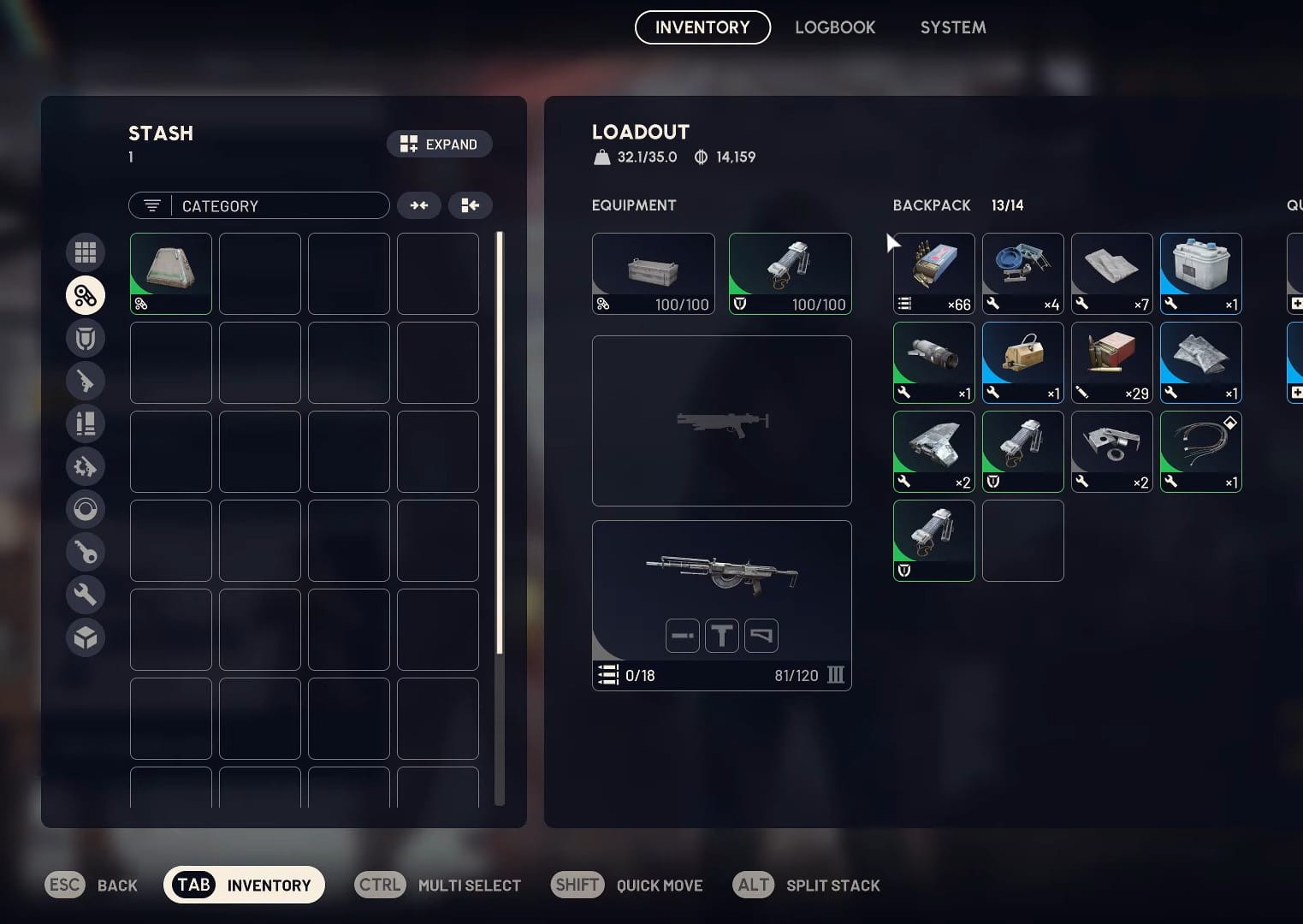 Open the inventory screen by pressing Tab on PC (or the equivalent button on console). This can be done either from the main menu in Speranza, the underground base, or directly while topside during a raid.