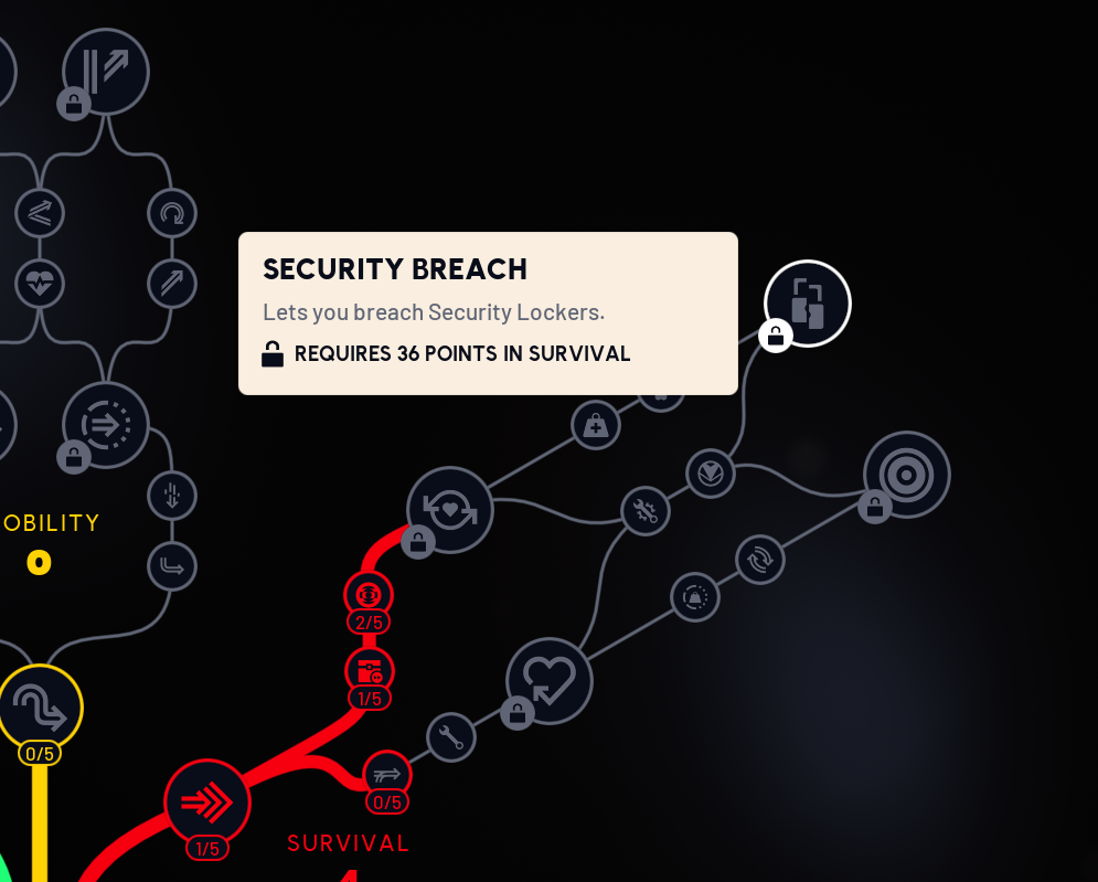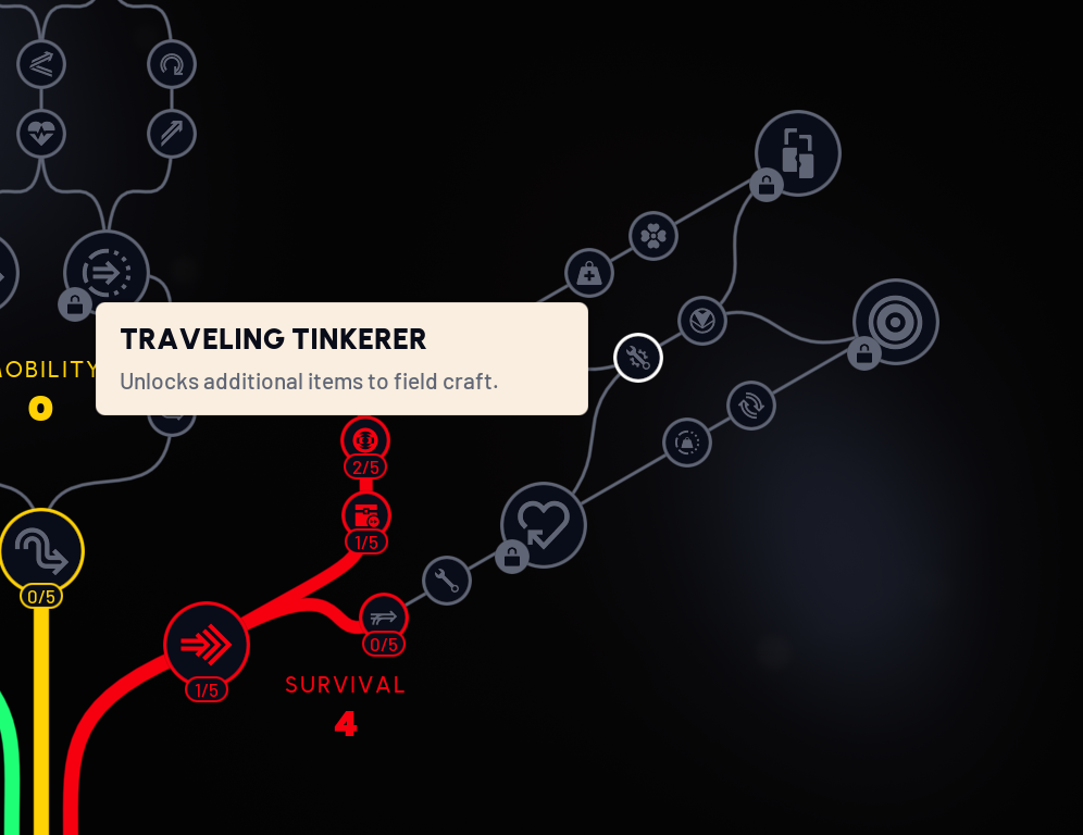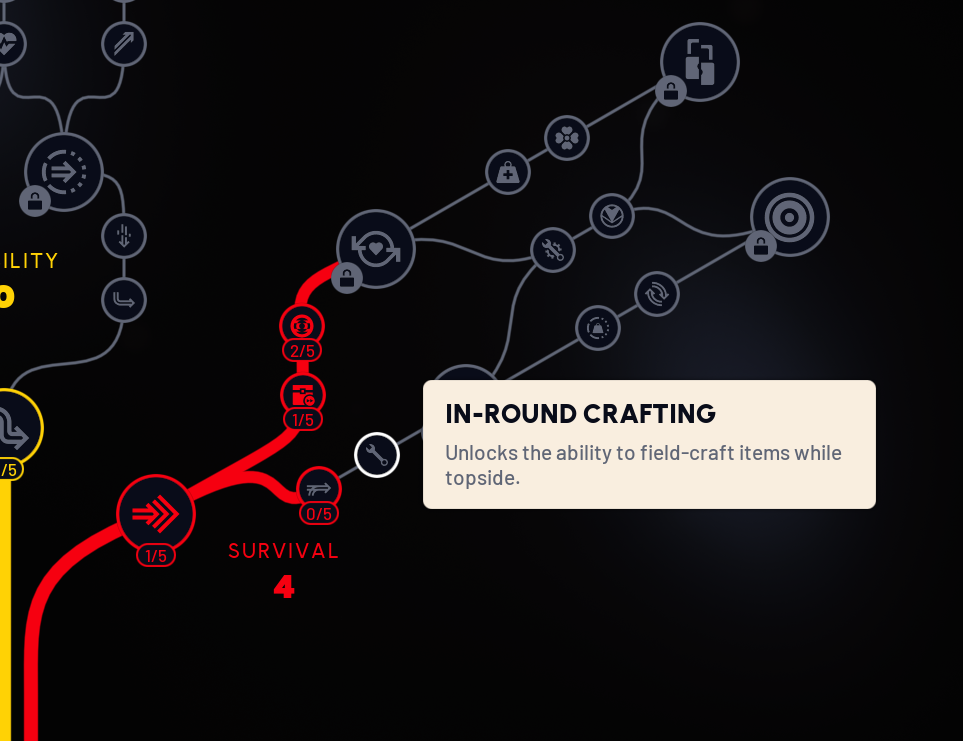 - Survival (Red): Focuses on looting efficiency, crafting during raids, and safer breaching of locked containers. This tree is essential for players who want to maximize their looting and successfully extract rare materials and gear.