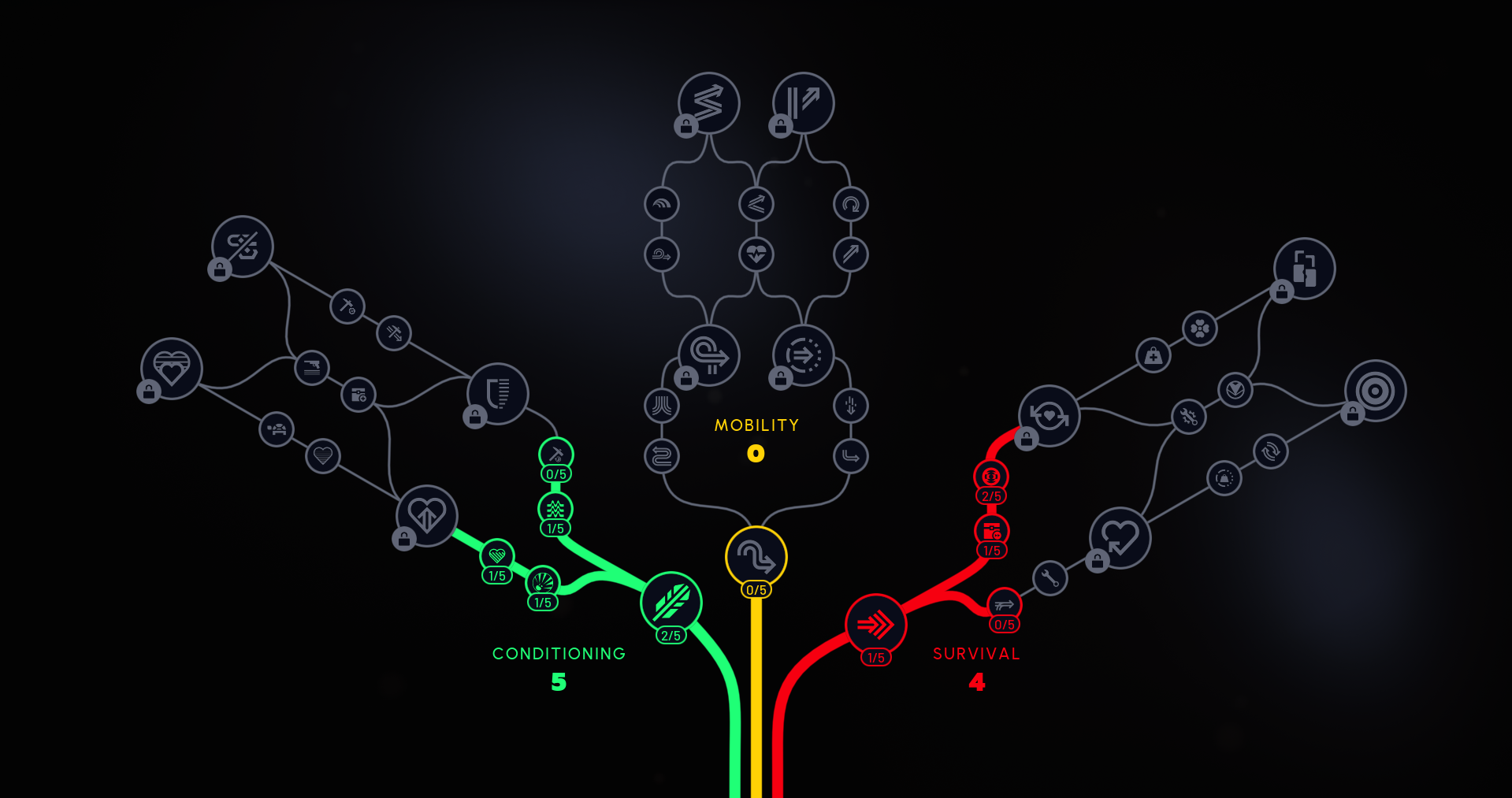 | Mobility | Major skills: Marathon Runner – reduce stamina drain while sprinting, vaulting, and dodging. Youthful Lungs – increase maximum stamina pool. Sturdy Ankles – reduce fall damage. Calming Stroll – stamina regenerates while walking. Revitalizing Squat – boost stamina recovery while crouching. Carry the Momentum – allows free sprinting after dodge rolls. Effortless Roll – reduce stamina cost for dodging. |