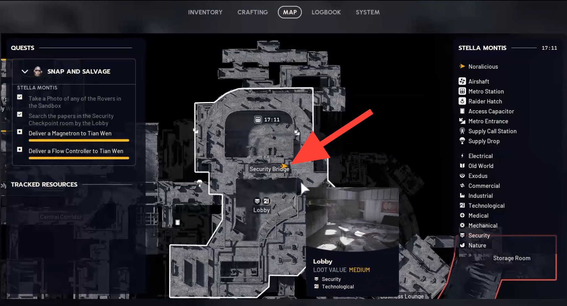 For the “Search the papers” objective, the Security Checkpoint room can be found on the upper floor of Stella Montis, close to the Lobby.