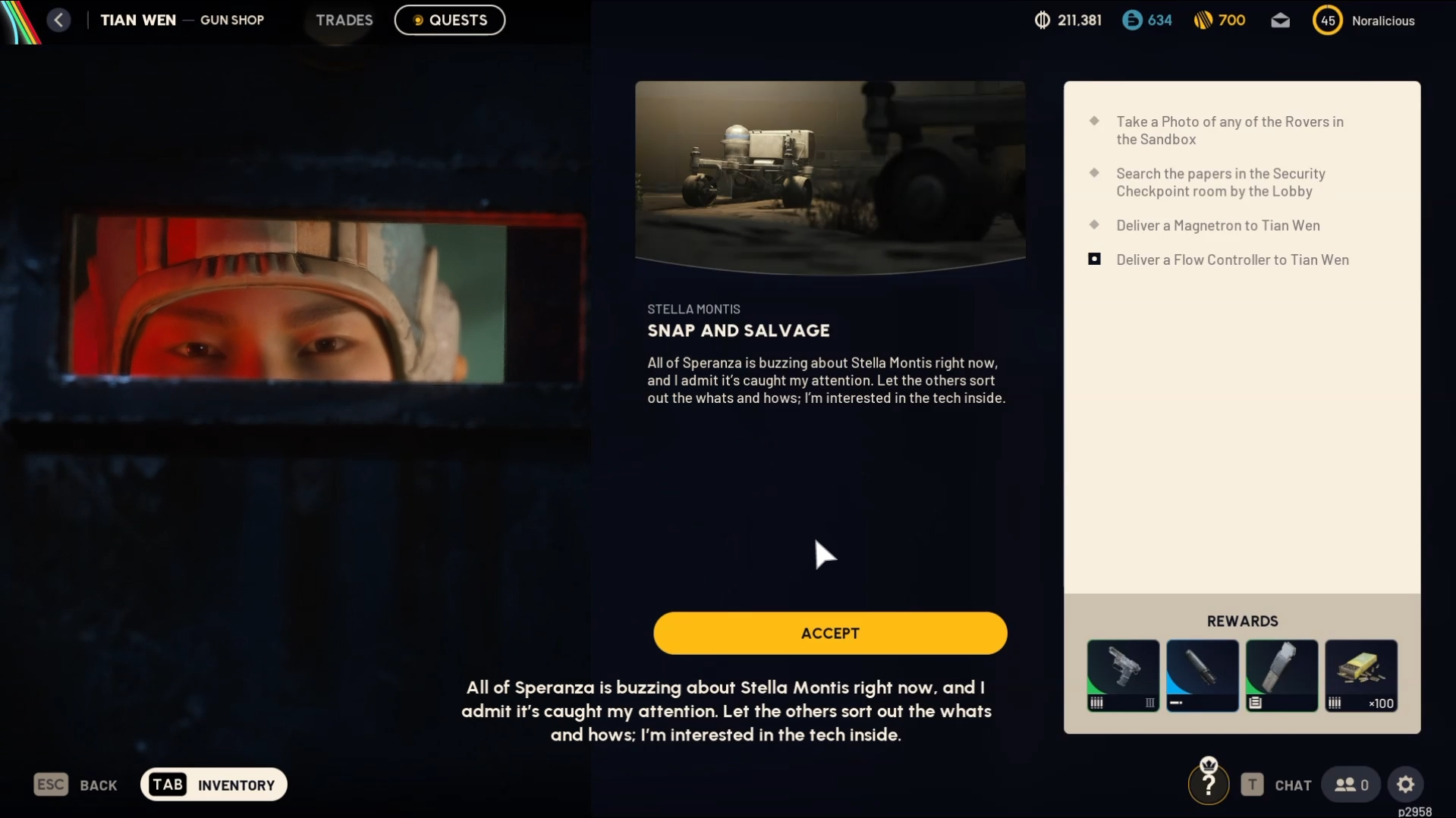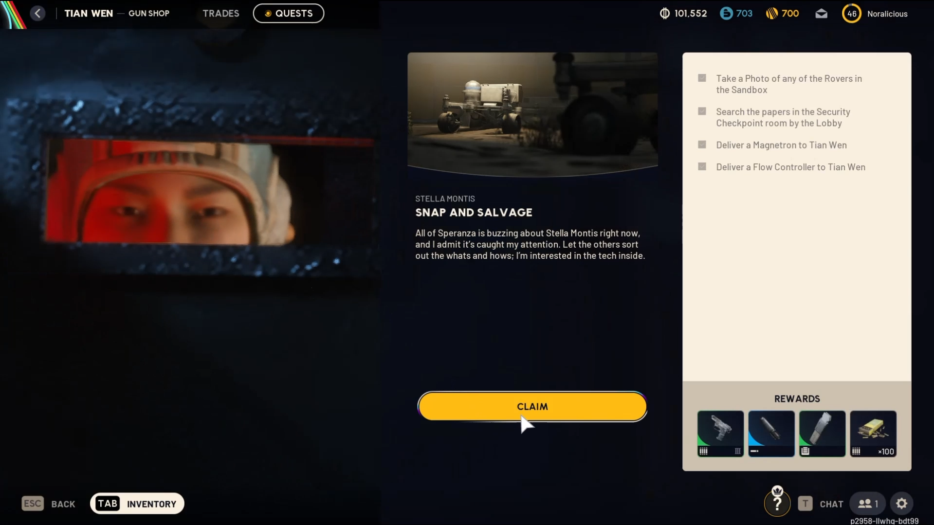 Snap & Salvage is a Stella Montis quest from Tian Wen where you photograph a rover, search papers at a security checkpoint, and collect two salvage items—a Magnetron and a Flow Controller. It’s a simple exploration-and-scavenging quest that rewards weapon mods and light ammo, offering early to mid-game gear upgrades.