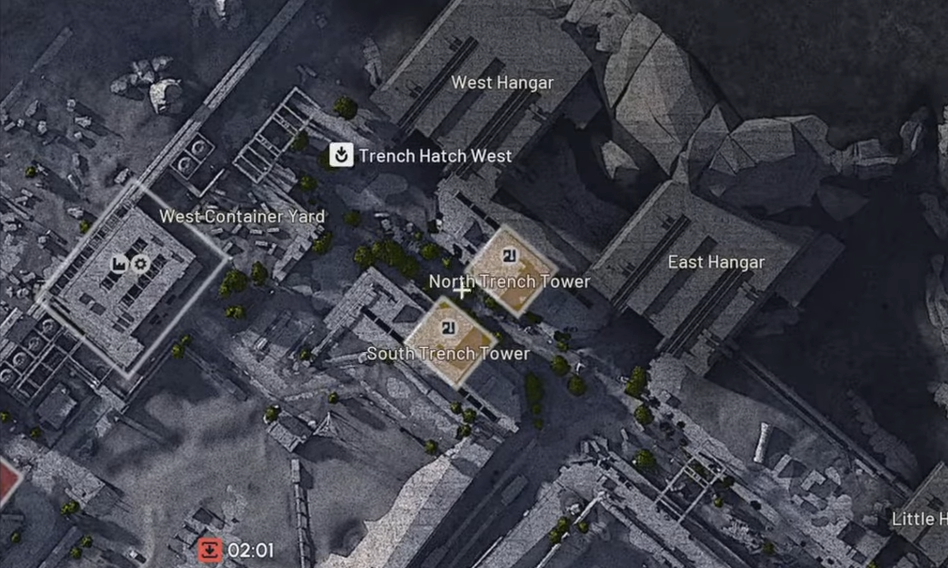 The Trench Towers are part of the broader Spaceport area, which includes several other notable points of interest, such as the Control Tower, Arrival and Departure Buildings, and Container Storage zones.